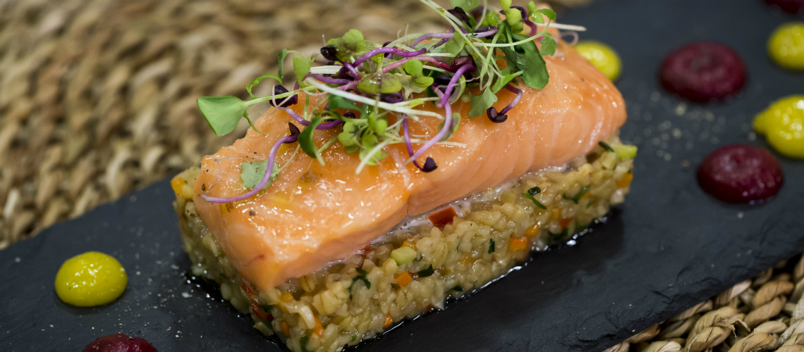 Tálaláskor a bulgurt a tányéron elhelyezzük, rá a konfitált lazacot, friss korienderrel és a maradék zöldségekkel dekoráljuk.