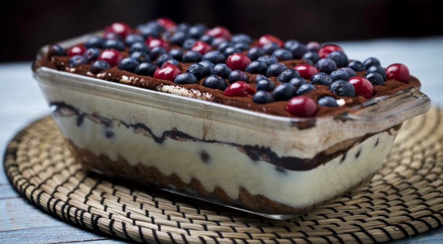 A vaníliás pudingport a leírtak szerint elkészítjük a tejjel. A magozott meggyet leszűrjük, a levét félretesszük egy nagyobb tálba, majd a babapiskótákat ebbe beáztatjuk. A beáztatott babapiskótákat egy nagyobb üvegtálba rétegezzük és a puding egy részét rákenjük. Megszórjuk bőven kakaóporral, majd a magozott meggyel és az áfonyával is. Jöhet egy újabb réteg áztatott babapiskóta, vaníliás puding, kakaópor és a gyümölcsök. Tálalás előtt pár órára a hűtőszekrénybe tesszük.