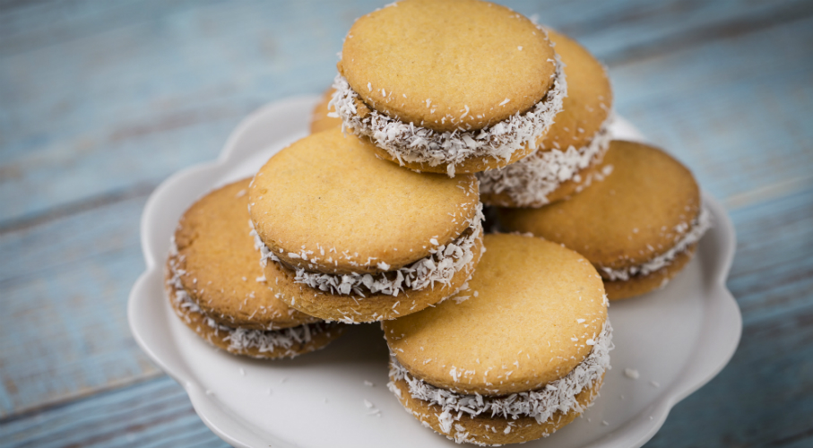 A vajat kihabosítjuk a cukorral, majd hozzáadjuk a tojássárgákat, konyakot és a vaníliát. Belereszeljük a citromhéjat. Beledolgozzuk a korábban összeszitált sütőporos lisztkeveréket. A tésztát fóliába csomagoljuk és hűtőben pihentetjük 1-2 órát. A tésztát kinyújtjuk, kis köröket szaggatunk belőle és 180 fokos sütőben, mérettől függően 8-12 perc alatt aranybarnára sütjük őket. Ha kihűltek, összeragasztjuk a karamellel, és az oldalukat kókuszreszelékbe forgatjuk.