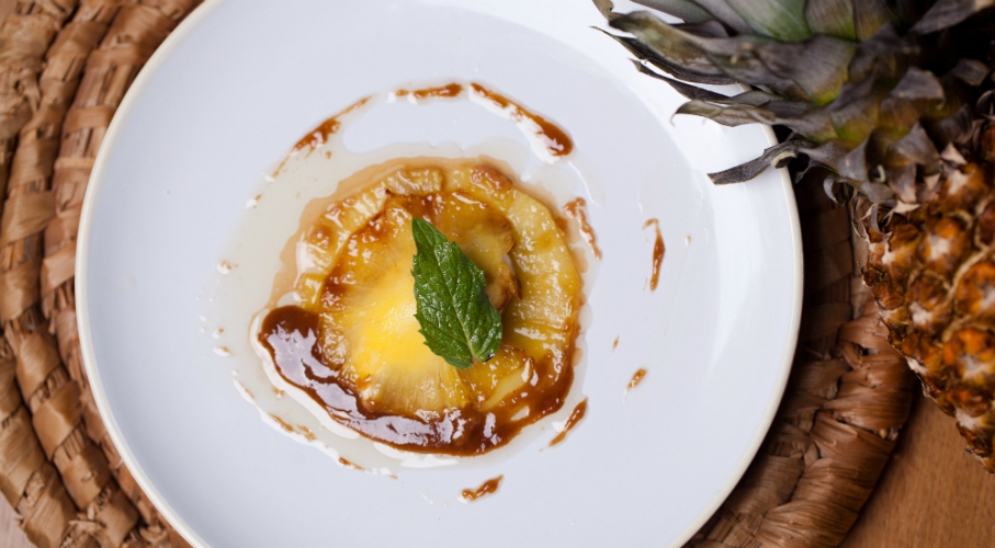 Az ananászt meghámozzuk, és vékony szeletekre vágjuk. Egy nagy serpenyőben felhevítjük a vajat és rászórjuk a cukrot. Amikor karamellizálódott, beletesszük az ananászkarikákat, és mindkét oldalon bevonjuk. A tányérra helyezzünk 1 szelet ananászt, tegyünk rá egy kis ahlom mascarone-t, és elfedjük egy másik ananász szelettel. A maradék karamellel meglocsolva azonnal tálaljuk.