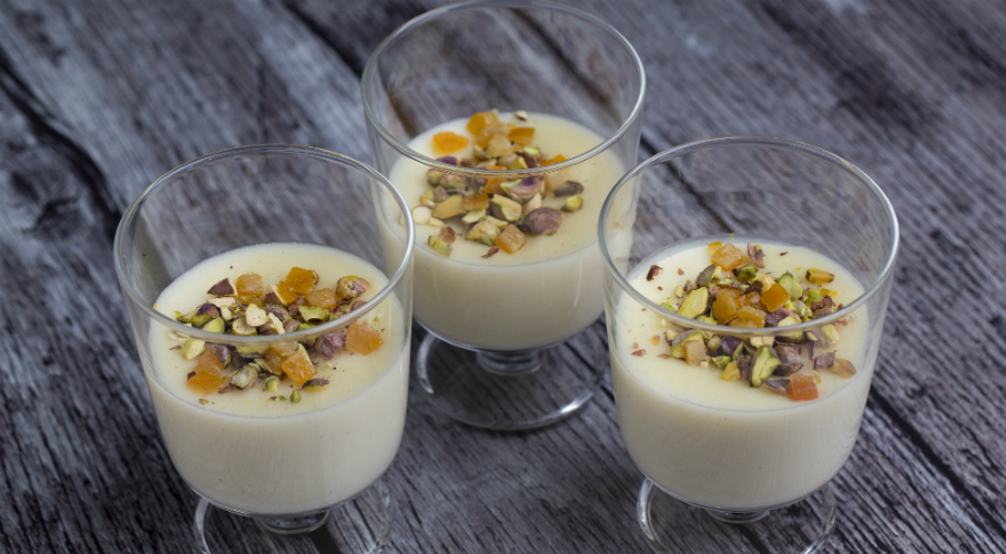 A tejet és a vizet lábosban a cukorral forráspontig melegítjük, a kukoricalisztet az 1 dl tejjel egy sűrű pasztává keverjük, így könnyebb lesz csomómentesre keverni a forró tejben. Folytonos kevergetés mellett sűrűre főzzük a tejjel. Ha elértük a puding állagot, hozzáadjuk a rózsavizet, majd poharakba töltjük és a felületüket folpack-kal fedjük be, hogy ne bőrösödjön meg. Ha kihűlt, akkor mindegyik adag tetjére friss eprszemeket szeletelünk, végül meghintjük durvára vágott pisztáciával.
