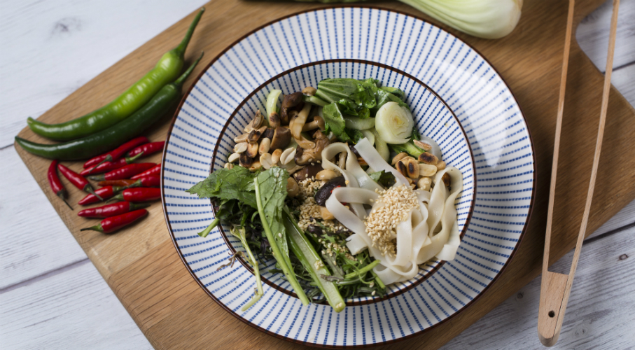 A tésztához vizet forralunk és azonnal a rizstésztára öntjük. Lefedjük és 10-15 percig állni hagyjuk, amíg a tészta megpuhul, majd leszűrjük. Az öntethez összekeverjük a rizsecetet a cukorral, szójaszósszal, halszósszal, szezámolajjal és a vízzel. Ha szeretjük, pár vékony szelet chilivel is ízesítjük. Az öntetet a lecsepegtetett tésztára öntjük. A földimogyorót és a szezámmagot száraz serpenyőben lepirítjuk, majd kiszedjük és félretesszük. A serpenyőbe 2 ek olajat öntünk és felforrósítjuk. A gombákat magas lángon lepirítjuk – fontos, hogy gyorsan piruljanak és ne eresszenek levet, ezért nem sózzuk őket, de megszórjuk frissen őrölt borssal! Ha a gombák megpirultak, 1 ek szójaszószt öntünk a serpenyőbe, gyorsan átforgatjuk benne a gombákat és az egészet kiszedjük. A olajos serpenyőben átforgatjuk a nagyobb darabokra vágott pak choit, hogy éppen csak egy kicsit összeessen. Ezt is kiszedjük, kevés pirított szezámolajjal meglocsoljuk. Összeállítjuk a salátát: a rizstésztát az öntettel két részre osztjuk, tálba szedjük. Akkor jó, ha bőven jut az öntetből, a tészta “tocsog” benne. A tetejére halmozzuk a pak choit, gombákat, friss zöldfűszereket, a pirított magokat és a csírát. Ízlés szerint szórjuk meg felaprított chilivel.