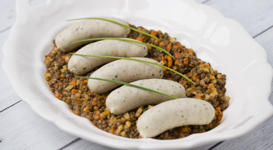 A szalonnát kockára vágva a zsírjára pirítjuk, majd a szintén apróra vágott vöröshagymát megpirítjuk benne. Hozzáadjuk a paradicsompürét, majd az apró kockára vágott gyökérzöldségeket. Sózzuk, borsozzuk és húsalaplével felöntve puhára pároljuk. Ekkor adjuk hozzá a külön fokhagymás, babérleveles lében megfőzött lencsét. Egybeforraljuk. A külön kifőzött fehér kolbász mellé, édes mustárral tálaljuk.