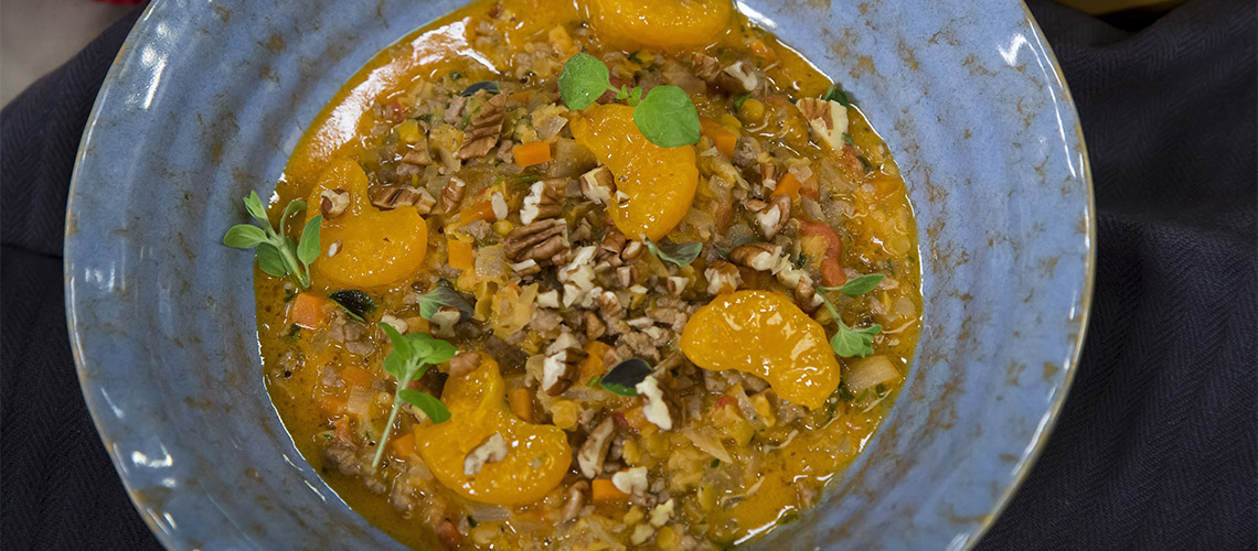 Most a lencsét is kezdjük hozzáadni az alaplével együtt. A kókusztejet is hozzáadjuk és egy kevés római köményt. Hagyjuk főni kb. 20 percig, majd az edénybe tegyük bele a paradicsomot, a sárgarépát és a fekete borsot, és addig főzzük, amíg a lencse megpuhul. A koriandert és a lime leveleket (vagy a levet) belekeverjük, fűszerezzük, és apróra vágott dióval és cukorban chilivel és lime-lével karamellizált mandarinnal tálaljuk.