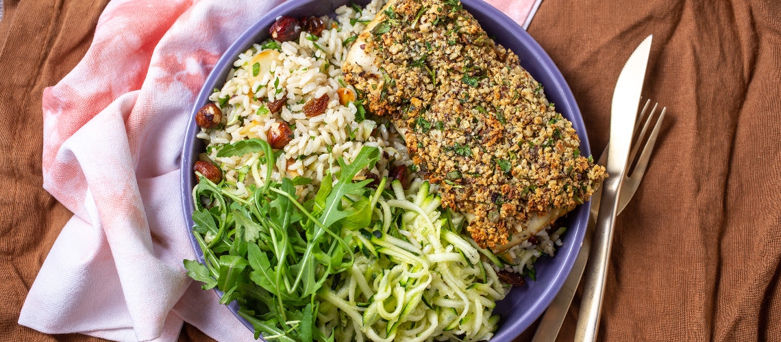 A cukkinit vékony csíkokra vágjuk vagy zöldségspirálozón felszeleteljük. Összeállítjuk a salátát: a rukkolát és a cukkinit elrendezzük a rizsen, az egészet meglocsoljuk a maradék öntettel és a sült halszeletekkel tálaljuk.