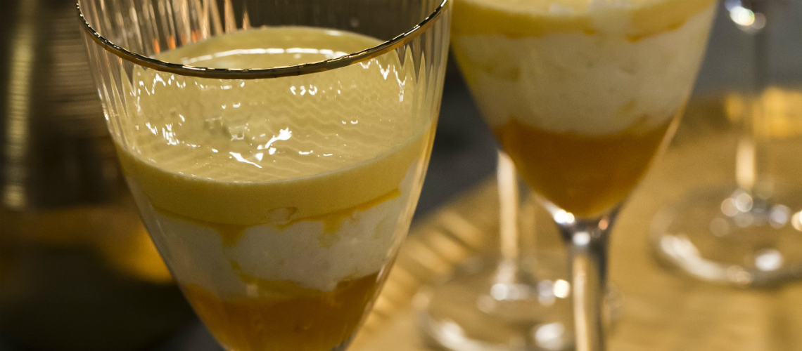 A barackpüréhez keverjük a felvert tejszínhabot és ezt is a pohárba kanalazzuk a barackragura. A pezsgőhabhoz egyenlő mennyiségű tojássárgáját kikeverünk ugyanannyi evőkanál kristálycukorral, majd folyamatosan kevergetve vízgőz fölött besűrítjük és hozzáadagoljuk a száraz pezsgőt. Ez is mehet a pohárdeszert tetejére.