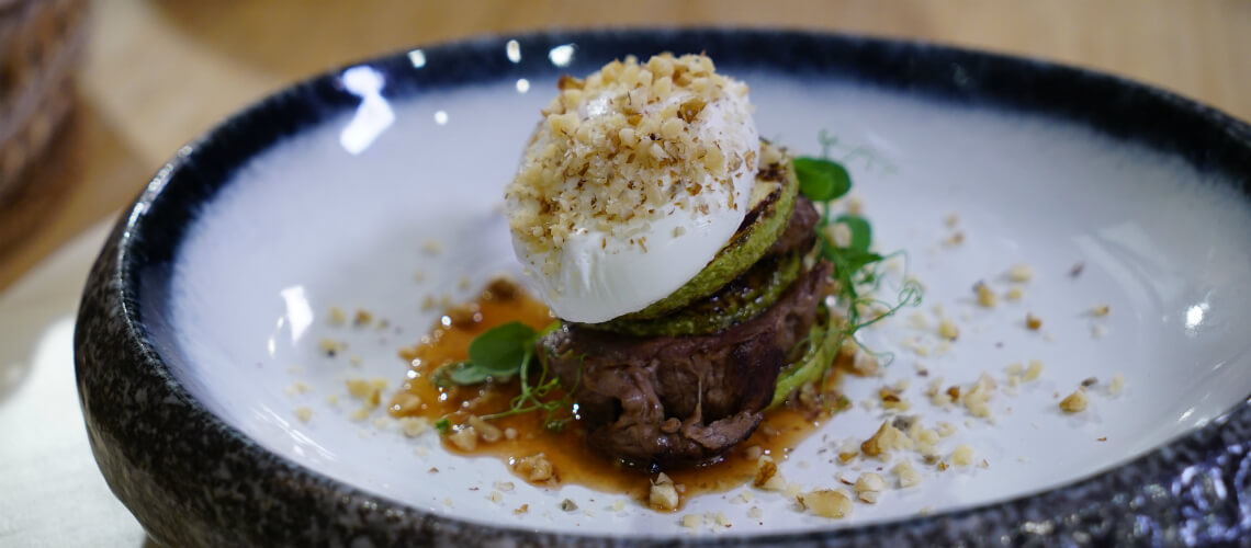 A medium rare-re sütött bélszín cukkini körettel és buggyantott tojással dió-köntösbe öltöztetve egy olyan étel, amit mindenki értékelni fog, azok is, akik elfogyasztják, és azok is, akik imádnak sütni-főzni.