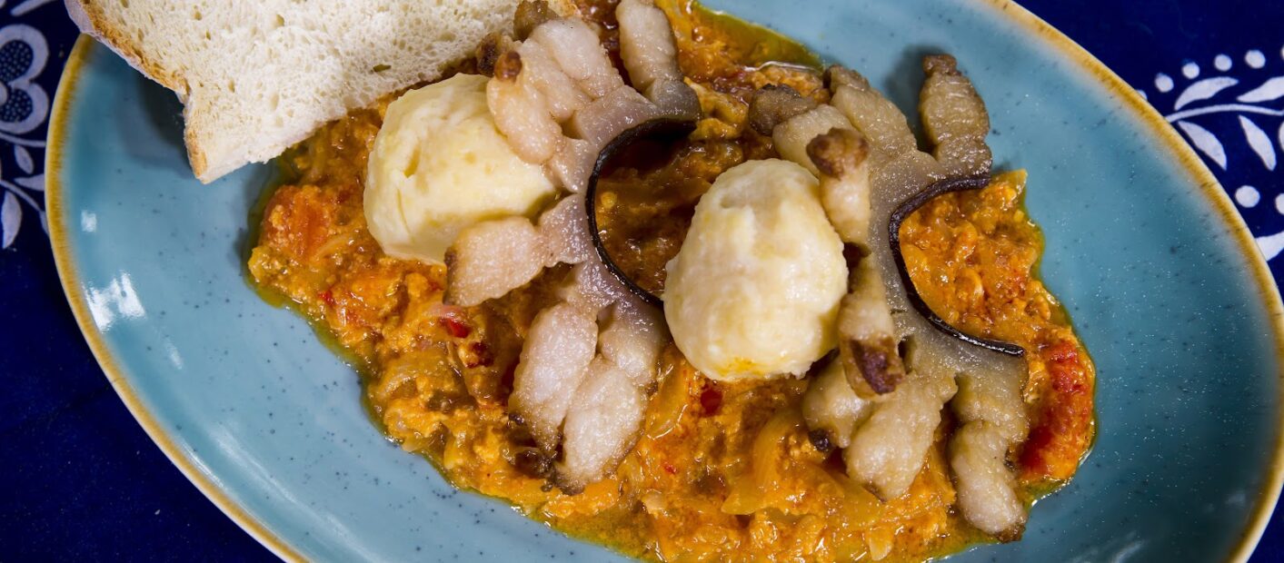 Az elkészült lecsót tálaljuk, amire ráhelyezzük a kész gombócokat, félretett szalonnával díszítjük.