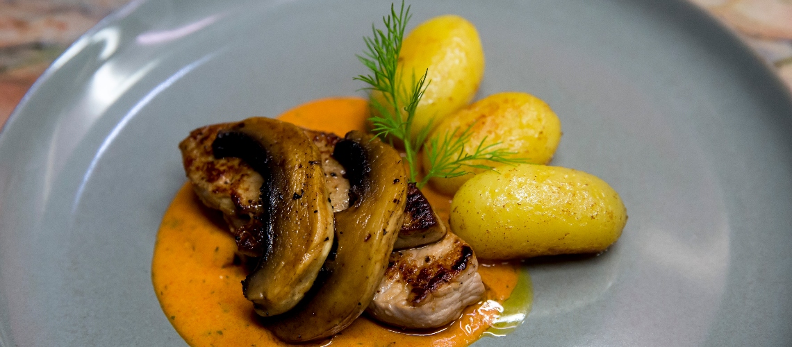 A vastagabbra szeletelt borjúkarajt rózsaszínre sütjük, pihentetjük, majd a mártásba helyezzük. A libamájat és a gombát szeletekre vágjuk, külön – külön kisütjük, a húsra helyezzük. Sós vízben főtt, vajban pirított burgonyával kínáljuk.