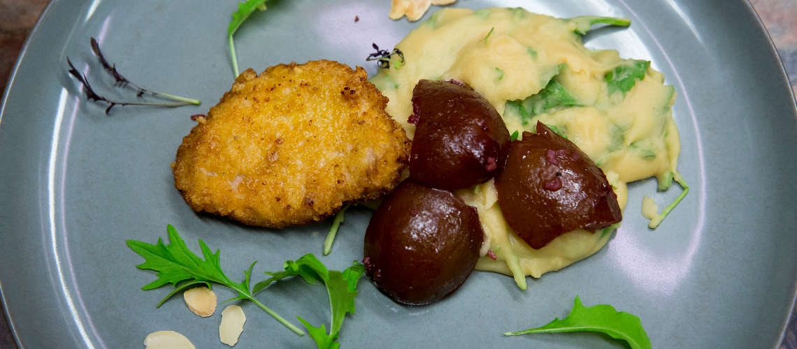 A szűzet vastagabb szeletekre vágjuk, kicsit megnyomkodjuk, majd rizslisztbe, tojásba és a tört abonettbe forgatjuk. Olvasztott vaj és olaj keverékében ropogósra sütjük. Az áztatott borsót fokhagymával és vöröshagymával puhára főzzük, leszűrjük, majd kevés tejszínnel pépesre mixeljük. Kevés olajban cukrot karamellizálunk, felöntjük vörösborral, reszelt gyömbért és vágott chili paprikát adunk hozzá. Sózzuk, borsozzuk, kicsit visszaforraljuk, és ebben pároljuk meg a szilvát. Tálaláskor a sárgaborsóba forgatjuk a friss rukkolát.