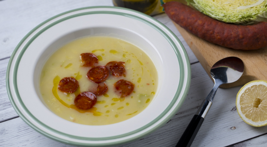 A szeletelt vöröshagymát és fokhagymát elkezdjük pirítani és hozzáadjuk a pucolt, darabolt burgonyát is. Sózzuk, borsozzuk, majd vízzel felöntve puhára főzzük. Pürésítjük és beletesszük a vékony csíkokra vágott kelkáposztát, valamint a külön megpirított, karikázott kolbászt. Néhány perc alatt összeforraljuk és tálaláskor olívaolajat, illetve citromlevet locsolunk a tetejére.