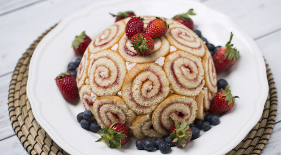Egy üvegtálat kibélelünk folpackkal, lehetőleg légmentesen. A zselatinlapokat hideg vízbe áztatjuk. A krémhez összekeverjük a túrót, a joghurtot a porcukorral. Hozzáadjuk a málnaszemeket és az egészet összepürésítjük. Közben a már elkészült lekváros piskótatekercset felszeleteljük és a szeletekkel kibéleljük a folpackkal kibélelt tálat. A zselatinlapokat kifacsarjuk és kevés vízben felmelegítjük, hogy elolvadjon. A málnás krémhez keverjük a habbá vert tejszínnel együtt. A krémet a piskótaszeletekkel bélelt tálba halmozzuk, a tetejére még rakunk piskótát. Befedjük fóliával, egy lapos tányérral lenyomjuk és egy éjszakára a hűtőbe tesszük. Megfordítva kiborítjuk, friss gyümölcsökkel tálaljuk.