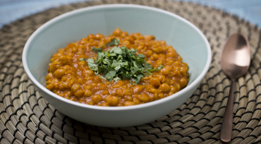 1 fej finomra vágott vöröshagymát és zúzott fokhagymát chili paprikával megpirítunk. Hozzáadunk kevés paradicsompürét. Őrölt korianderrel, római köménnyel, friss gyömbérrel és curry porral fűszerezzük. Hozzáadjuk az előfőzött csicseriborsót és árpagyöngyöt. Kevés vízzel, vagy alaplével felöntve puhára pároljuk. Sózzuk. A végén kókusztejjel beforraljuk. Tálaláskor friss korianderrel szórjuk.