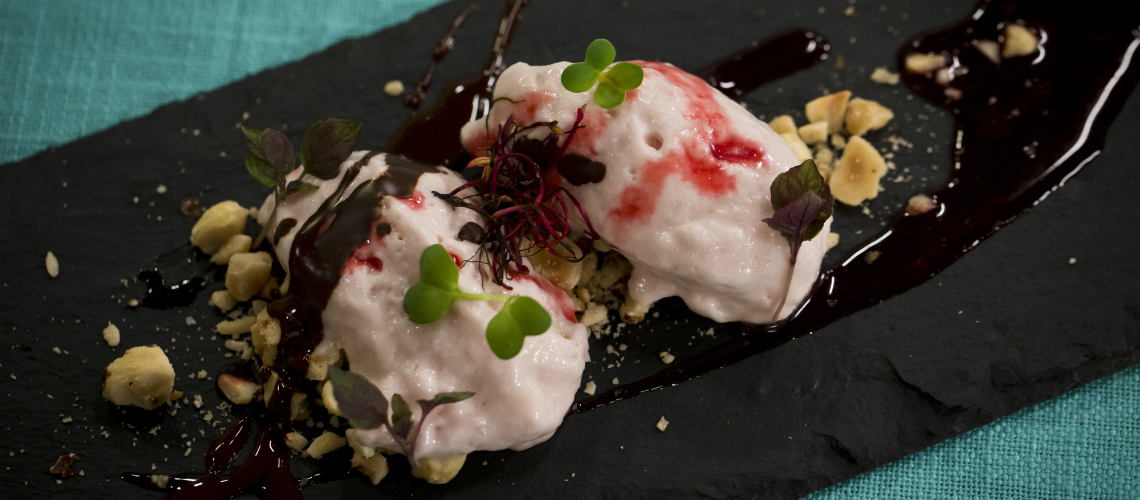 Egy lábosba beletesszük a vizet és cukrot és 121 fokra hevítjük, közben felverjük a tojásfehérjét, alacsony fordulatszámon. Amikor a cukor elérte a megfelelő hőfokot, ráöntjük a fehérjére, tovább verjük a géppel, amíg kemény habot kapunk. Málnakrémet készítünk: a cukrot és a málnát együtt feltesszük főni. Turmixoljuk, majd egy szűrőn átpasszírozzuk és kiszedjük a magokat. A habtejszínt kemény habbá verjük, hozzáadjuk a habcsókot, és végül a málna krémet is hozzáadjuk. Aprított mogyoróval díszítjük.