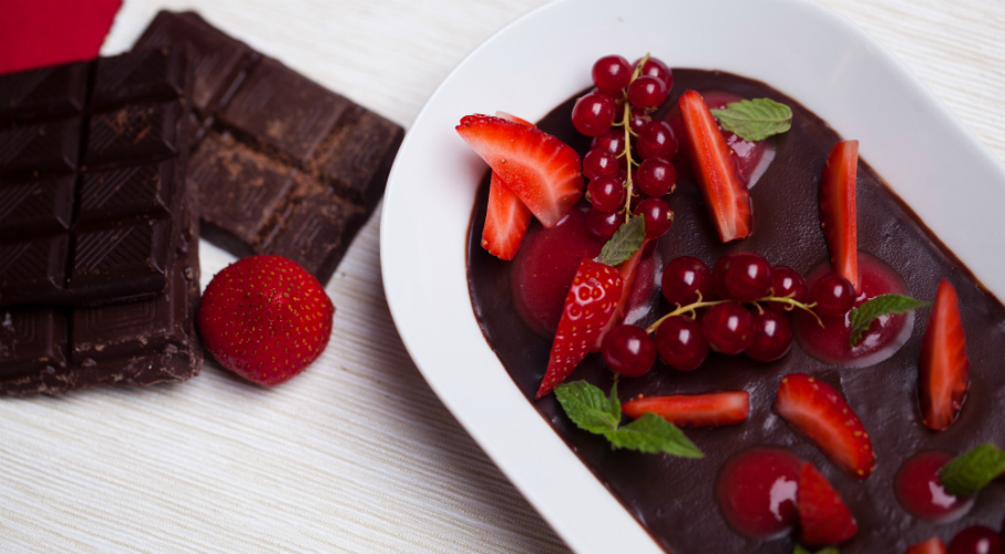A tejszínt felforraljuk a rozmaringgal, cayenne borssal, majd műanyag fóliával lefedve félretesszük. Nagyjából 30 percig pihentetjük, hogy a fűszerek aromája átjárja a tejszínt. Leszűrjük, majd újra felforraljuk. Belekeverjük a csokoládét és a mézet. Szilikon fromákba töltjük és a következő napig tegyük a hűtőbe. Egy kislábosba szórjuk az erdei gyümölcsök 2/3-át, a cukrot, a borsot és sót, és a vodkával összefőzzük. Összeturmixoljuk és átszűrjük. A ganache-t kiszedjük a formából és a maradék gyümölccsel megszórjuk.
