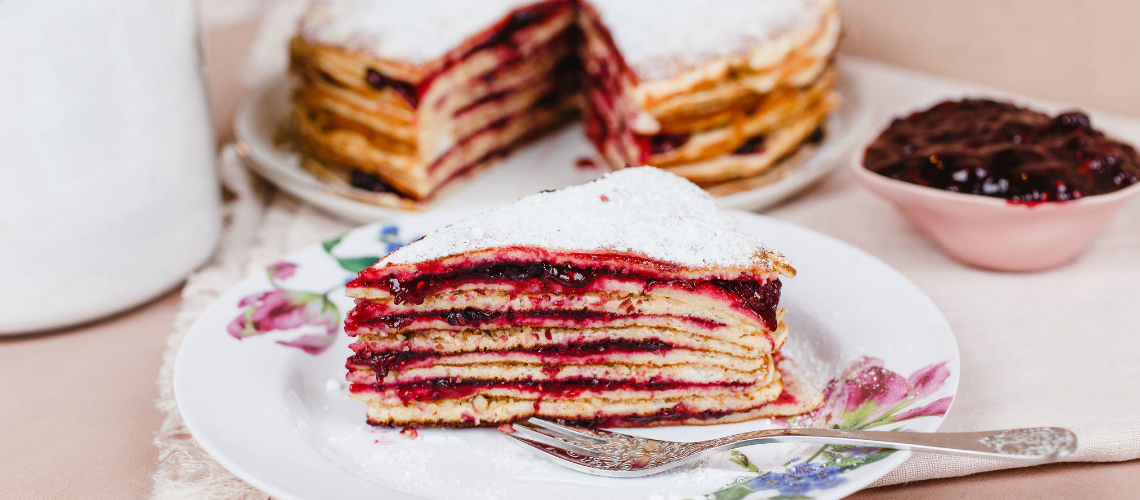 A tojásfehérjéből habot verünk majd hozzáadjuk a maradék cukrot és folytatjuk a habverést, amíg stabil, fényes habot kapunk. Óvatosan a masszához forgatjuk és azonnal kisütjük a palacsintákat. A csúsztatott palacsintát csak az egyik oldalán sütjük meg. A palacsintákat felváltva rétegezzük darált dióval és a lehűlt lekvárral. A tetejére úgy tesszük az utolsó palacsintát, hogy a sült oldala kerüljön felülre. Porcukorral meghintve tálaljuk.