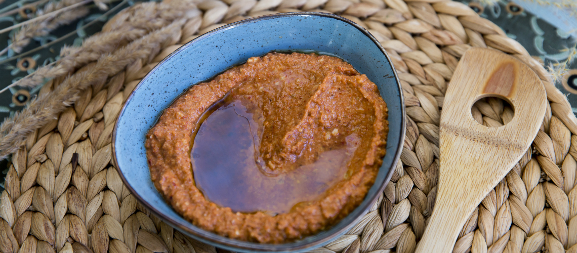 A sütőt grillfokozatra, vagy a lehető legforróbb fokozatra állítjuk. A paprikát félbevágjuk, kimagozzuk, és alufóliával bélelt tepsire helyezzük, a vágott felével lefelé. Addig sütjük, amíg a héja fekete és hólyagos lesz. Mély tálba tesszük, lefedjük frissentartó fóliával, majd kb. 15 percig így hagyjuk. Ez idő alatt a paprika összeesik, és a héja szépen lehúzhatóvá válik. (Csíkokra vágva, némi olívaolajjal meglocsolva napokig eláll a hűtőben, akár 3-4 nappal előre is elkészíthető). Robotgépben vagy botmixerrel simára pürésítjük a sült paprika húsát az összes többi hozzávalóval: a darabokra vágott fehér kenyérrel, a durvára vágott dióval, az olívaolajjal, a citromlével, a római köménnyel és a gránátalmasziruppal. Ha túl hígnak találjuk, dióval és kenyérrel sűrítjük, ha túl tömörnek, olívaolajjal, citromlével, esetleg kevés vízzel lazítjuk. Ennek a krémnek kifejezetten jót tesz, ha áll néhány órát, hogy jól összeérjenek az ízek. Mártogatóként kínáljuk, friss pitával vagy zöldségekkel.