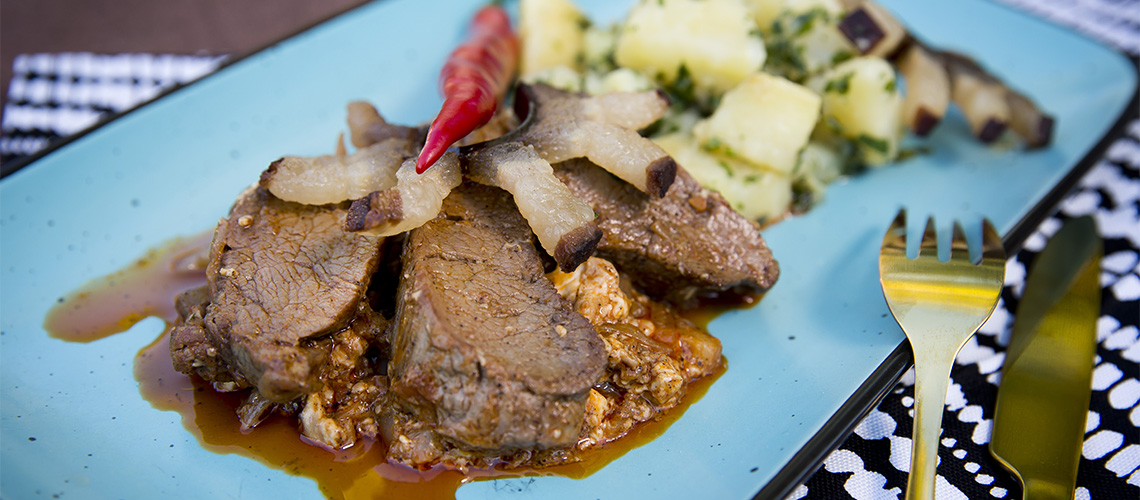 Az agyvelős raguban összeforgatott szűzpecsenyét a főtt burgonyával tálaljuk, apróra vágott petrezselyemzölddel megszórva.