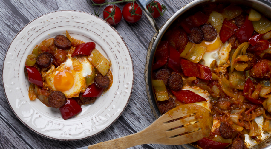 A kolbászt felszeleteljük és egy serpenyőben pirosra sütjük. Papírtörlőre szedjük a kolbászt, félretesszük. A kápiát, a csípős paprikát és 1 db tv paprikát nagyobb darabokra vágunk és a kolbászzsíron megpirítjuk. Kiszedjük, félretesszük. A serpenyőbe kevés zsírt teszünk, ezen puhára pároljuk a felszeletelt hagymát és fokhagymát. Közben sózzuk. Hozzáadjuk a maradék tv paprikát, félpuhára pároljuk, majd a paradicsomot leforrázzuk, lehúzzuk a héját. A nagyobb paradicsomot felkockázva, a koktélparadicsomot egészben a serpenyőbe tesszük, megszórjuk a fűszerpaprikával, őrölt köménnyel és puhára főzzük. Végül összeforgatjuk a lecsót a pirított paprikákkal, 1 tojást ütünk bele egészben és addig főzzük, amíg a tojás fehérje megszilárdul, de a sárgája folyós marad. Belerakjuk a lepirított kolbászkarikákat is.