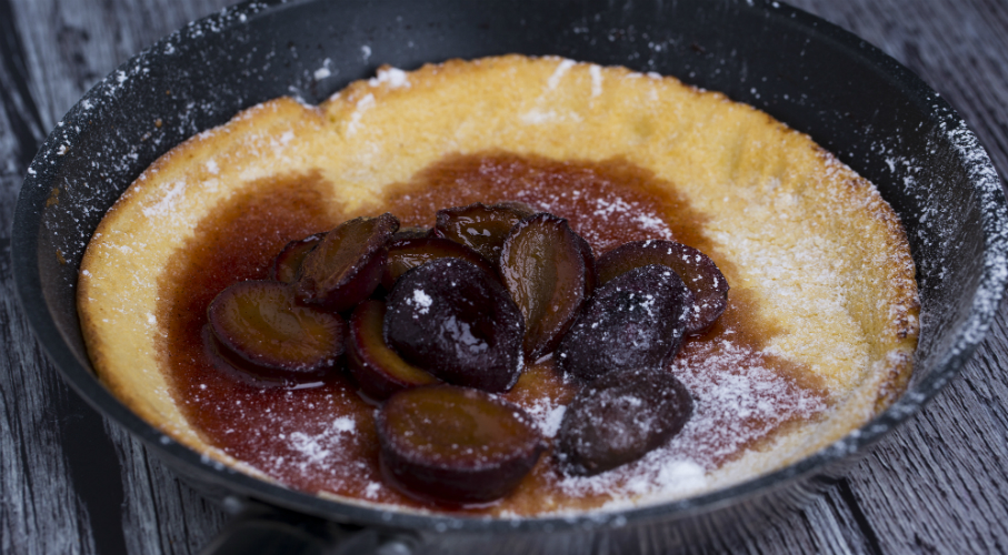 A tojást egy keverőtálban, egy robotgép segítségével kissé felverjük, majd hozzáadjuk a tejet és a tejszínt is. A lisztet beleszitáljuk és a rúd kikapart magjait is hozzáadjuk és az egészet összekeverjük. Egy serpenyőben felolvasztjuk a vajat és beleöntjük a tésztát, majd 200 fokra előmelegített sütőben kb. 18-20 percig sütjük. Egy serpenyőben megolvasztjuk a vajat és kissé hagyjuk megbarnulni, majd rádobjuk a feldarabolt szilvát. Megszórjuk a barnacukorral és összerázzuk. Ráfacsarjuk a citrom levét. A megsült dutch babyre öntjük a meleg szilvaragut és megszórjuk porcukorral.