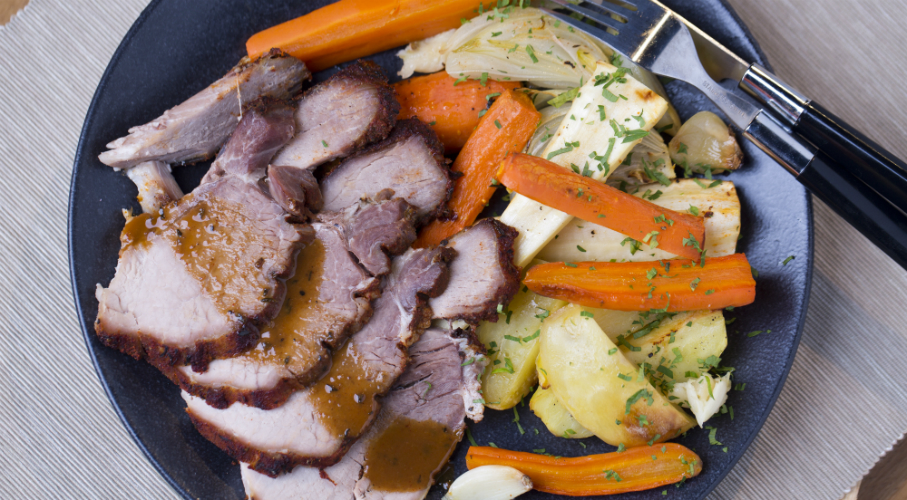 Fűszerkeveréket készítünk a fűszerekből. A húst alaposan bedörzsöljük a fűszerkeverékkel. Egy nagy hőálló tálba rácsot teszünk, rátesszük a húst, aláöntünk annyi vizet, hogy ne érjen a húshoz, alufóliával letakarjuk és 160 fokos sütőben 2 órát sütjük. Levesszük a fóliát: a negyedelt hagymát, a hasábokra vágott burgonyát, a feldarabolt sárgarépát és paszternákot a hús köré rendezzük. Meglocsoljuk egy kevés olajjal, sózzuk, borsozzuk, rámorzsoljuk a kakukkfüvet és visszatesszük a sütőbe. 180 fokon 40-45 percig sütjük, amíg a zöldségek megpuhulnak és a hús pirosra sül.