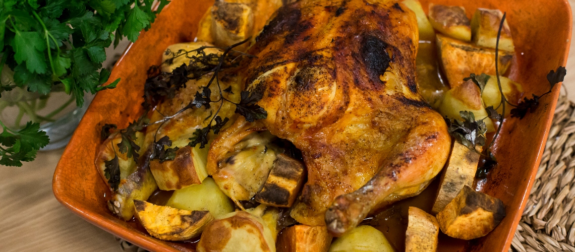 A csirkét kívülről és belülről alaposan ízesítsük sóval, borssal és paprikával, a zöldségeket pedig vágjuk nagyobb darabokra. Melegítsük elő a sütőt 200 fokra. A csirke bőre alá vajat, citromszeleteket nyomunk, fehérbort öntünk alá, 1 órán át sütjük, majd hozzáadjuk a burgonyát és az édesburgonyát. Süssük további 40 percig, amíg aranyszínű nem lesz, és amíg a burgonya meg nem puhul.
