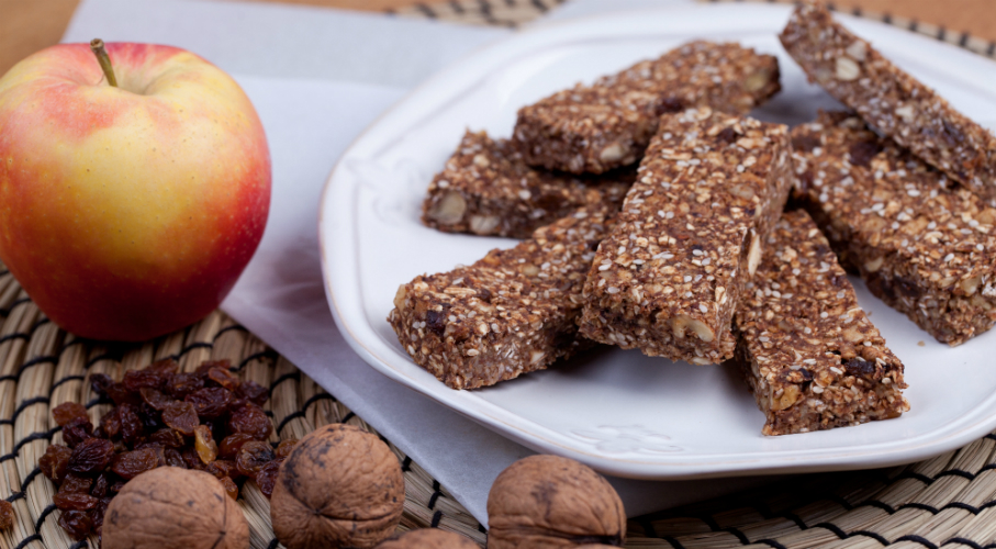 A sütőt melegítsük elő 200 fokon. Az almát hámozzuk, reszeljük le, keverjük hozzá a zabpelyhet a durvára vágott diót, mandulát, a szezámmagot, az apróra vágott aszalt szilvát, a mazsolát és a fahéjat. Sütőpapírral bélelt sütőlemezre formázzunk belőle 1,5-2 cm magas téglalapot, tegyük be sülni 10 percre. Vegyük ki a sütőből, hagyjuk kihűlni, éles késsel szeleteljük.