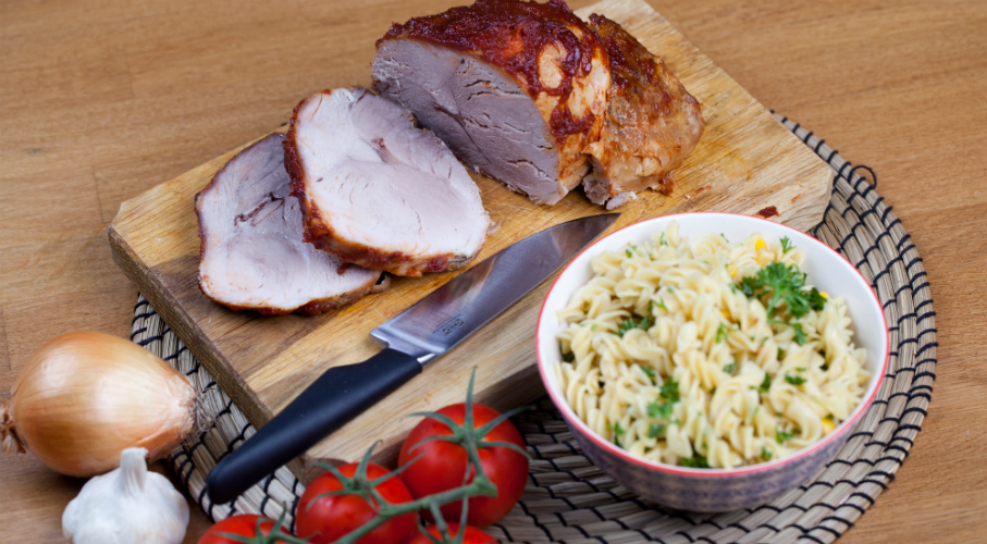 A húst bőségesen sózzuk, borsozzuk körbe, tegyük tűzálló tálba, tegyük köré a darabolt hagymát, alufóliával fedjük le, és 160 fokos sütőben 3-3,5 óra alatt süssük omlósan puhára. BBQ-szósz: a reszelt hagymát dinszteljük meg 3 ek. olívaolajon. Keverjük hozzá a paradicsomszószt, az ecetet, a Worchestershire szószt, a mézet. Adjuk hozzá az aprított fokhagymát és 30 perc alatt főzzük sűrűre a mártást. A megsült húst kenjük meg a BBQ szósszal, tegyük vissza grillfokozatra a sütőbe, míg a mártás itt-ott rápirul. A tésztát főzzük ki lobogó, sós vízben. Szűrjük le, keverjük el a szezámolaj, csiliszósz, lime-lé keverékével. Adjuk hozzá a zúzott fokhagymát, a lecsöpögtetett kukoricát, az aprított petrezselymet.