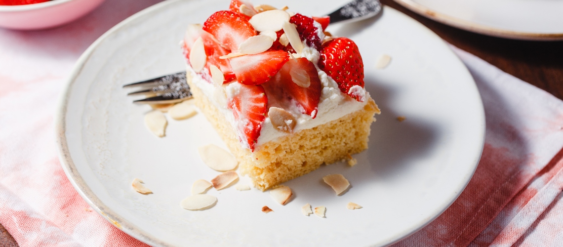 A krémhez a mascarponét habosra keverjük, közben hozzáadjuk a porcukrot, majd a krémet behűtjük. Megkenjük a lehűlt tésztát a hideg krémmel és egy órára a hűtőbe tesszük. Fogyasztás előtt megszórjuk pirított mandulaszeletekkel és eperrel díszítjük.