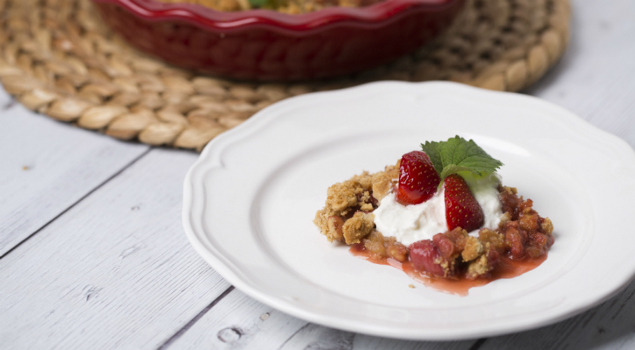 A rebarbarát meghámozzuk és kis darabokra vágjuk. Az epret megtisztítjuk és félbe vágjuk. A formát kikenjük vajjal, beleszórjuk a gyümölcsöt és megszórjuk cukorral. A kekszet sodrófával vagy robotgéppel összeaprítjuk, hozzáadjuk a cukrot, a lisztet és a darabokra vágott vajat. A keveréket a gyümölcsökre szórjuk és a forró sütőbe tesszük. 180 °C-on 30 percig sütjük. Aludttejjel kínáljuk.