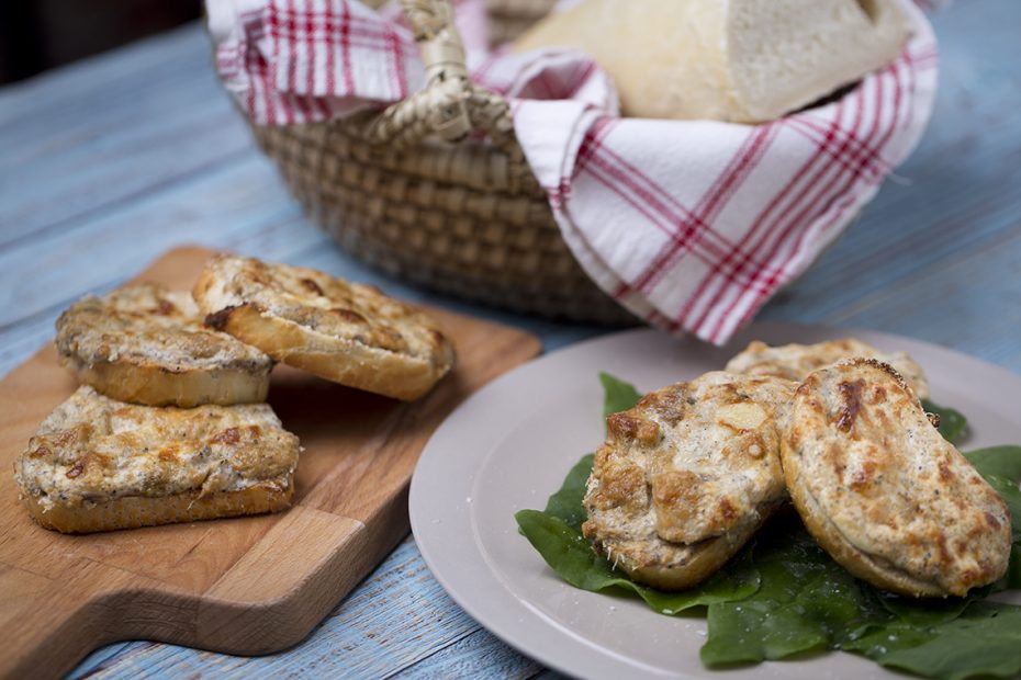 A hagymát, a fokhagymát és a petrezselymet megfuttatjuk zsiradékon, hozzáadjuk az erdei gombát, és néhány perc párolás után meglocsoljuk fehérborral. Levesszük a tűzhelyről, és apróra vágjuk. Egy tálba tesszük, és Philadelphia krémsajttal valamint egy kanál szarvasgomba krémmel krémesre kavarjuk. Bagett szeletekre kenjük, és sütőben ropogósra sütjük.