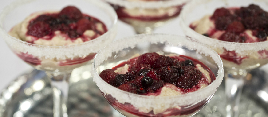 A megáztatott piskótadarabokat a poharak aljába pakoljuk, erre jön a gesztenyekrém, majd a gyors gyümölcslekvár.