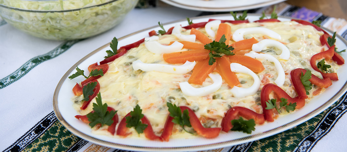 A zöldséget és a húst megfőzzük, majd kihűtjük.