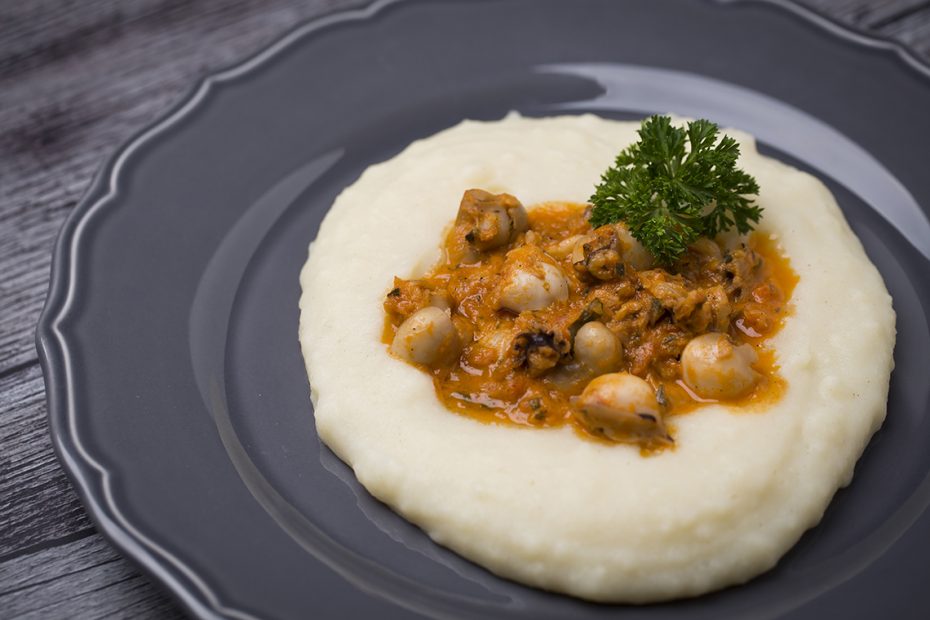 Megtisztítjuk a tintahalat, a hagymát megfuttatjuk zsiradékon, majd adunk hozzá fokhagymát, és további 5 percig pirítjuk. Ezután beletesszük a tintahalat is, meglocsoljuk fehérborral. Majd a végén adunk hozzá 2-3 kanál paradicsomszószt, valamint bazsalikomot. Megfőzzük a puliszkát, a közepére lyukat formálunk, és beletesszük a tintahalat.