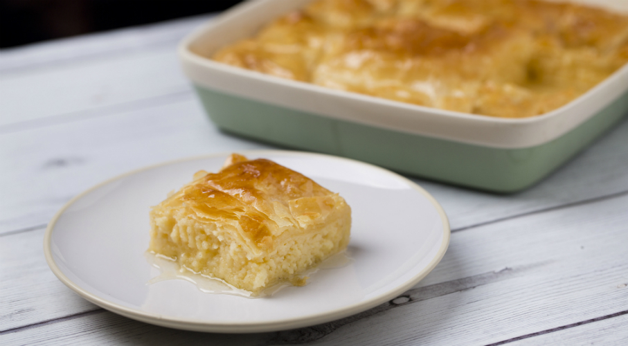 A réteslapok felét lefektetjük az edénybe és minden lapot meglocsolunk olvasztott vajjal. 5 dkg cukorral kihabosítjuk a tojássárgáját, majd a másik 5 dkg cukorral fényes habbá verjük a fehérjét. Ezt a két masszát lágyan összeforgatjuk. Ezután egy edénybe tesszük a tejet, a tejszínt és a vaníliát, majd beleszórjuk a búzadarát. Amikor levesszük a tűzről a krémet, belekeverjük a vajat. A tojáshabot és a főzött grízes krémet összekeverjük, majd félretesszük. A hozzávalókból szirupot főzünk, kb. felére főzzük vissza. A réteslapokra borítjuk a grízes krémet, majd újabb adag réteslappal fedjük be. Sütőbe tesszük, 160 fokon 60-70 percig sütjük. Ha kivettük, még melegen meglocsoljuk a sziruppal.