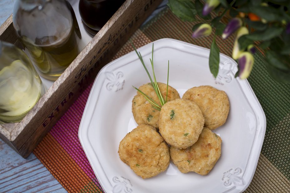 A hagymát megfuttatjuk zsiradékon, hozzáadjuk a rizst, felöntjük vízzel, és 15-20 percig főzzük. Ezután kiszedjük egy tálba, és hagyjuk hűlni. Amikor kellően kihűlt, beletesszük a tojásokat és a parmezánt. Egy másik tálba tesszük az apróra vágott mozzarellát, garnélát, fokhagymát és petrezselymet. A rizsből golyókat formálunk, a közepükbe lyukat nyomunk, és teszünk a mozzarellás, garnélás masszából. A tenyereink közt ismét golyó alakúra formáljuk, zsemlemorzsába forgatjuk, és kisütjük.