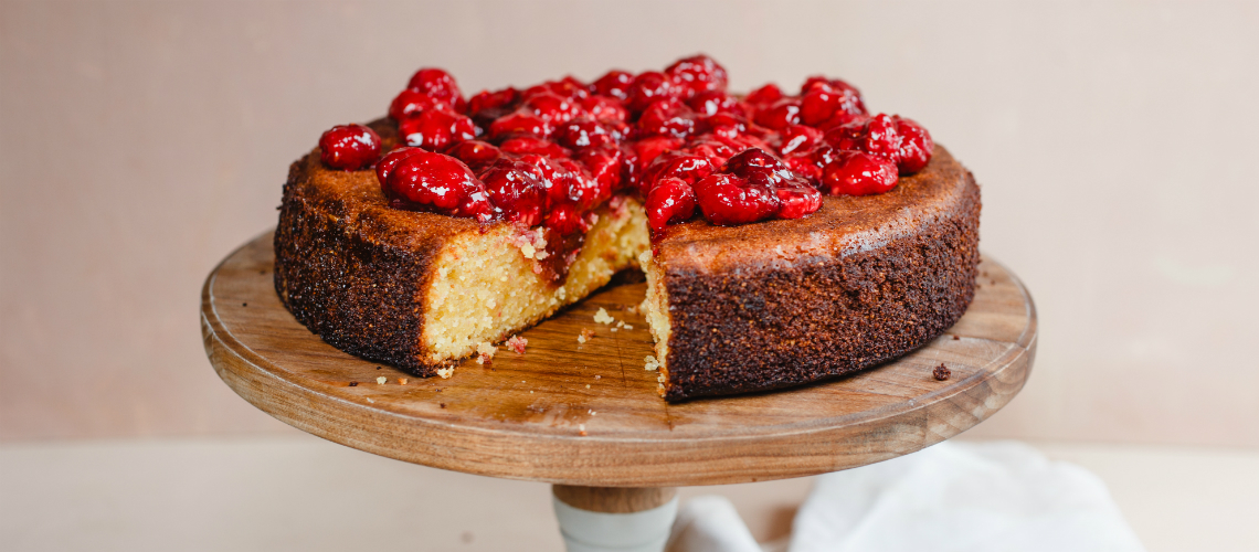 Közben a málnalekvárt egy kis lábasban felforraljuk és 2-3 percig rotyogtatjuk, hogy kissé besűrűsödjön, hozzáadjuk a friss málnát és azonnal lehúzzuk a tűzről. Összekeverjük, hogy a friss gyümölcs éppen csak összeessen. Hagyjuk kihűlni és tálaláskor a kihűlt sütemény tetejére kanalazzuk.