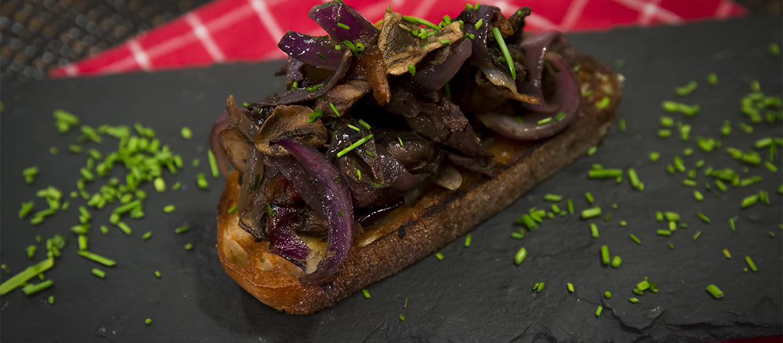 A hagymát a kiolvasztott szalonnazsíron megpirítjuk, hozzáadjuk a fokhagymát és a tisztított csirkemájat, majd végül a gombákat. Meglocsoljuk borral és ízesítsük. Állandó keverés mellett beforraljuk. Adjuk hozzá a fűszernövényeket, a metélőhagymát és enyhén pirítsuk át. A kenyeret ropogósra sütjük, enyhén megfokhagymázzuk és tálaljuk.