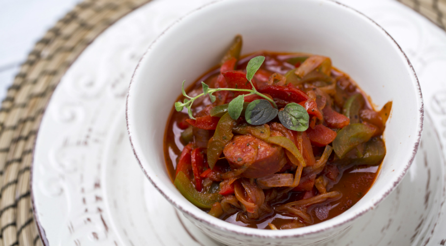 A kolbászt vágjuk fel nagyobb darabokra. A hagymát daraboljuk fel, a paprikákat szeleteljük fel csíkokra. Egy serpenyőben kevés olajon pirítsuk meg a hagymát, fokhagymát, adjuk hozzá a paprikacsíkokat. Öntsük fel paradicsomszósszal és a vörösborral. Főzzük, amíg a bor kissé elpárolog. Fűszerezzük sóval és oregánóval. Ekkor tegyük vissza a zöldséges szószba a kolbászdarabkákat és főzzük még 15-20 percig, amíg a zöldségek megpuhulnak, és a szósz besűrűsödik.