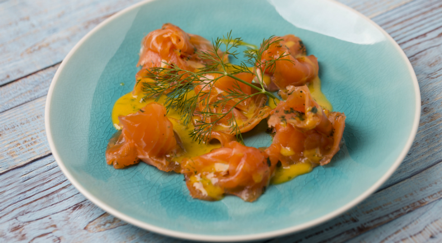 A lazacfilét félbevágjuk, majd összekeverjük a sót, a cukrot és a borsot. Ennek a keveréknek kb. a 1/3-át egy tál aljába szórjuk, majd bőrével lefelé ráfektetjük a fél lazacot. Megszórjuk a finomra vágott kaporral, kevés citromhéjat reszelünk rá és rászórjuk a fűszeres keverék második harmadát. Ráborítjuk a lazac másik felét hússal lefelé és befedjük a maradék fűszerekkel. Fóliával letakarjuk, majd lesúlyozva hűtőben min. 1, de inkább 2 napig pácoljuk. A tojások sárgáját olajjal alaposan kikeverjük, hozzáadjuk a mustárt, kevés ecetet. Sózzuk, enyhén cukrozzuk. Ezzel a mártással tálaljuk a pácból kivett, alaposan letörölgetett, vékonyra szeletelt lazacot.