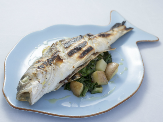 2 kg mosott újkrumplit sós vízben megfőzünk, közben ugyanennyi tisztított mángoldot egy kis olívaolajon megpárolunk, majd a leszűrt krumplihoz keverjük. Személyenként 1-1 darab durbincsot vagy branzinot sózzuk, szárazra töröljük, majd forró és nagyon tiszta grillrácson, egyszer fordítva megsütjük és a mángoldos krumplival tálaljuk.
