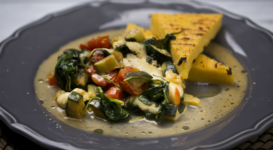 A polentát az utasítás szerint elkészítjük. Hozzáadjuk a vajat, a parmezánt, az olívaolajat, a sót, a borsot és a fokhagymát. Vajjal kikent és száraz polentával megszórt tepsibe töltjük. A tetejét elsimítjuk és kb. 30 percig sütjük. A kihűlt polentát darabokra vágjuk és száraz grillserpenyőn megpirítjuk. Közben serpenyőben megsütjük a cukkinit a paradicsommal és a bébispenóttal. A forró serpenyőre egy kis olívaolajat öntünk, amin megfuttatjuk a fokhagymát, majd hozzáadjuk a kockára vágott cukkinit, és a félbe vágott koktélparadicsomokat. Végül hozzáadjuk a spenótot, 1 percig keverjük, míg összeesik. végül hozzáadjuk a kisebb darabokra vágott mozzarellát és azonnal tálaljuk a meleg, sült polentával.
