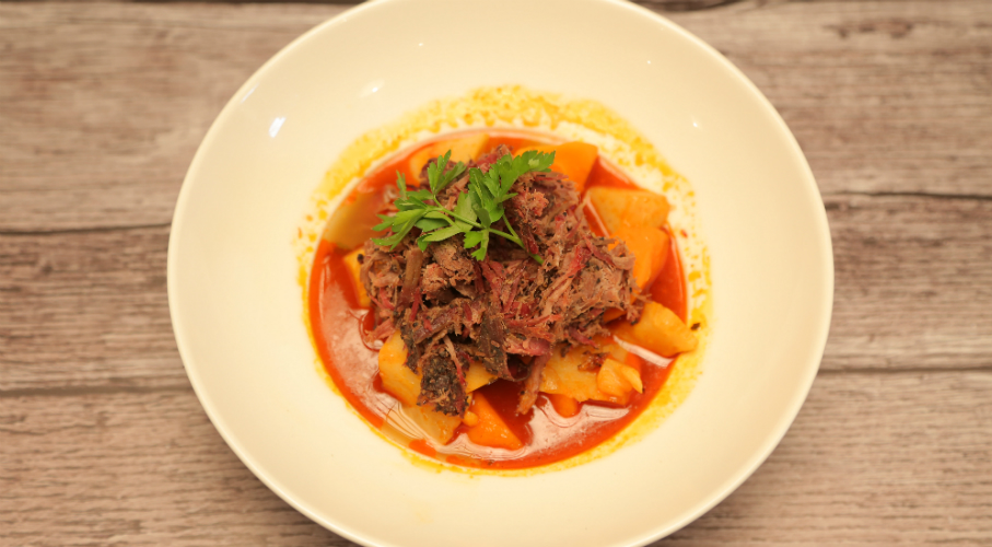 A zöldségeket nagyobb darabokra vágjuk, a kiolvasztott szalonnazsíron megforgatjuk, majd felöntjük forró vízzel. Fűszerezzük, és készre főzzük. Betétnek a húst beletépkedjük.