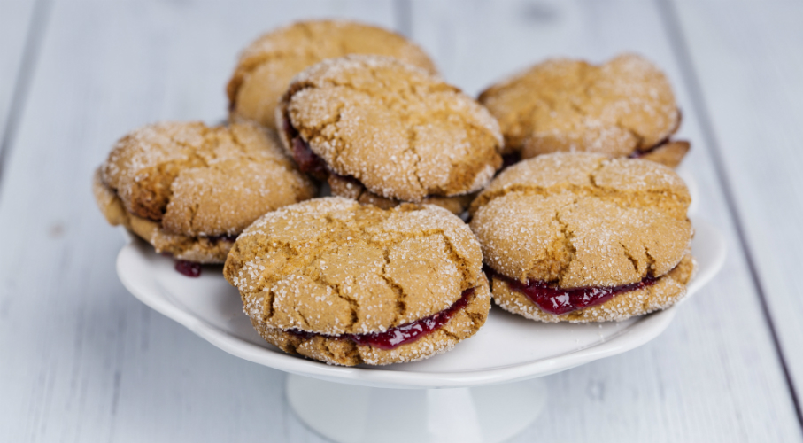 A vajat a 20 dkg cukorral habosra keverem, hozzáadom a juharszirupot. Ezután belekeverem az előre felvert tojást is. A masszához adagolom az előre összekevert száraz alapanyagokat – liszt, sütőpor, fahéj, gyömbér, és jól összedolgozom. A maradék 10 dkg cukrot egy tálba teszem. A tésztából fél evőkanálnyi labdákat a cukorba pottyantok és minden oldalon beleforgatom őket, majd a sütőpapírral kibélelt tepsire teszem a cukros golyókat. Egymástól 7-8 cm-re, mert szét fognak terülni. 170 fokos sütőben kb 15 perc alatt készre sülnek a kekszek. A sütőből kivéve rácson kihűtöm, majd a lekvárral megkenem és összeragasztom őket.