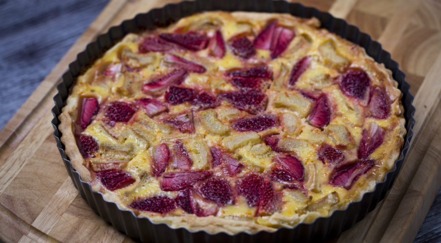 A hozzávalókból tésztát gyúrunk és pihentetjük min. 2 órát. A piteformába nyújtott tésztát lesúlyozzuk és 195 fokon sütjük 15 percet, majd súly nélkül 5-10 percet. A töltelékhez feldaraboljuk az epret és a rebarbarát.. A tojást, a tejszínnel, cukorral, vaníliás cukorral kikeverjük, hozzáadjuk a citrusok héját, majd a gyümölcsökre öntjük. 180 fokon készre sütjük 20-30 perc alatt.