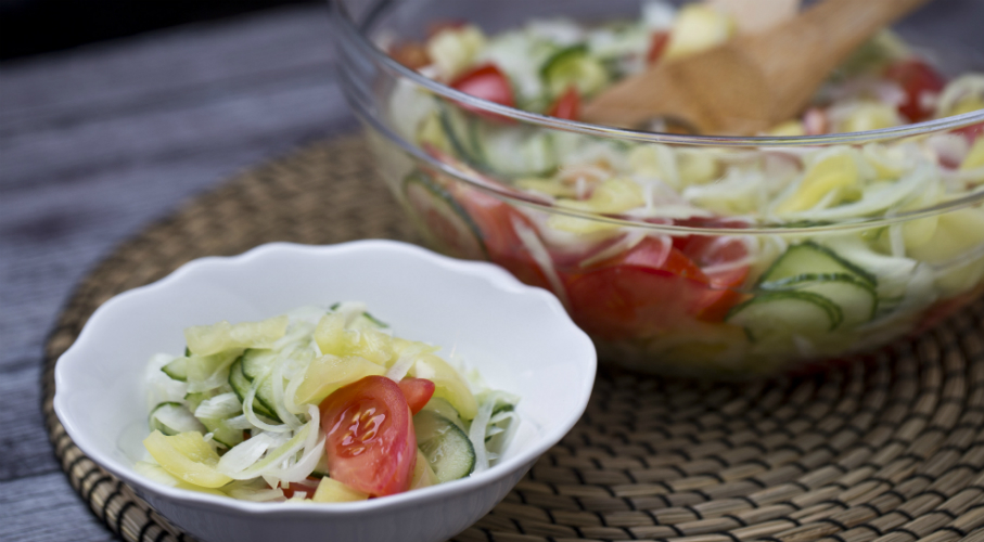 A tv paprikát, vöröshagymát és a kígyóuborkát vékonyra szeleteljük, lesózzuk. Miután állt, kinyomkodjuk és a cikkezett paradicsommal együtt hozzákeverjük a cukorral, ecettel, kevés olajjal és vízzel készült hagyományos salátaléhez. A cukkinit vagy lereszeljük, vagy nagyon vékony csíkokra vágjuk. Összeforgatjuk a darabolt koktélparadicsommal, a pirított lenmaggal, a mozzarellával és a rukkolával. Tálaláskor citromlével, pezsgővel és kevés mézzel készült öntettel locsoljuk meg.