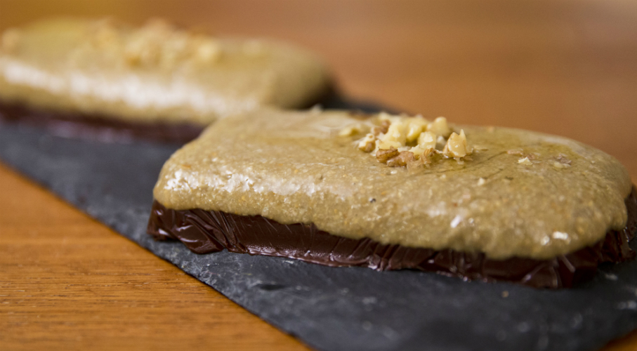 A napraforgómagot száraz serpenyőben megpirítjuk, majd kihűtjük és robotgéppel porrá őröljük. Elkeverjük a mézzel. Vízfürdő felett összeolvasztjuk a csokoládét és vajat. Hozzáadjuk az aprított diót. A formát műanyag fóliával kibéleljük. A formába töltjük a keveréket. Elterítjük, majd ráöntjük az olvasztott csokoládét. A hűtőbe tesszük dermedni 1 órára, vagy a fagyasztóba 1/2 órára.