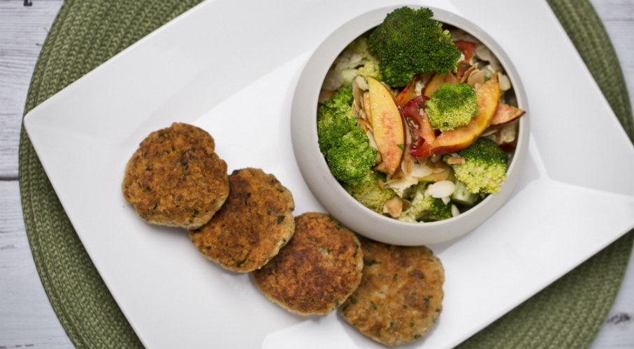A darált harcsa filét sózzuk, borsozzuk, aprított petrezselymet és snidlinget, 1 db egész tojást, 1 db főtt reszelt tojást adunk hozzá. Zsemlemorzsával átkeverjük, majd kevés olajban pirosra sütjük. Néhány szelet sült citromcikket adhatunk mellé. A salátához a brokkoli rózsákat leforrázzuk, lehűtjük. Friss vágott bazsalikomból, narancsléből, citromléből olívaolajjal egy dresszinget készítünk, melyet összeforgatunk a brokkolival és a nyers, csíkokra vágott kínai kellel. Koktélparadicsommal és pirított mandulával szórva tálaljuk.