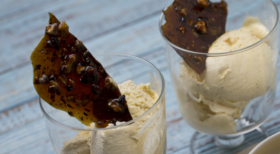 A tejet és a tejszínt alacsony lángon feltesszük főni a vanília rúd kikapargatott magjaival. A tojássárgáját kikeverjük a cukorral, majd szűrőn át ráüntjük a tejet. Visszaöntjük a keveréket egy tiszta edénybe és pár perc főzéssel besűrítjük. A meleg vaníliasodóba étcsokit keverünk. Hagyjuk lehűlni, és fagyigépbe tesszük a masszát. Amíg a gép dolgozik, készíthetünk egy kis mogyorógrillázst a fagyiba.