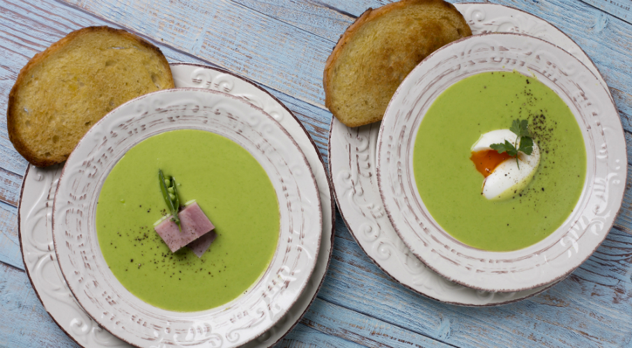 Egy nagyobb edényben a hagymát és fokhagymát üvegesre dinszteljük. Felöntjük az alaplével, és hozzáadjuk a borsót. Kb. 8 percig főzzük. Sózzuk és borsozzuk. Összeturmixoljuk és hagyjuk kihűlni. Egy kisebb edényben vizet forralunk. A forrásban lévő vízbe tesszük a tojásokat, és 5 percig főzzük. A tojásokat azonnal lehjűtjük és meghámozzuk. A levest egy darab sonkával vagy tojással kínáljuk. A tojást közvetlenül tálalás előtt felvágjuk, hogy a sárgája kicsorduljon. Zöldfűszerekkel és egy szelet fehérkenyérrel kínáljuk.